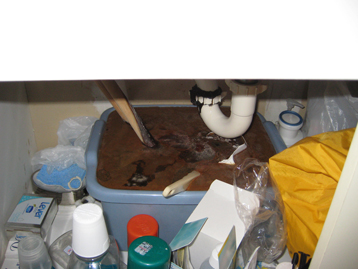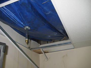 Roof leak with a tarp inside. Why repair the roof when you can drain the tarp?