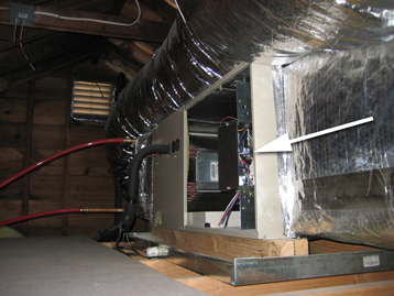 Open air handler in attic. Also note the drain pan with no drain pipe!